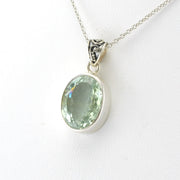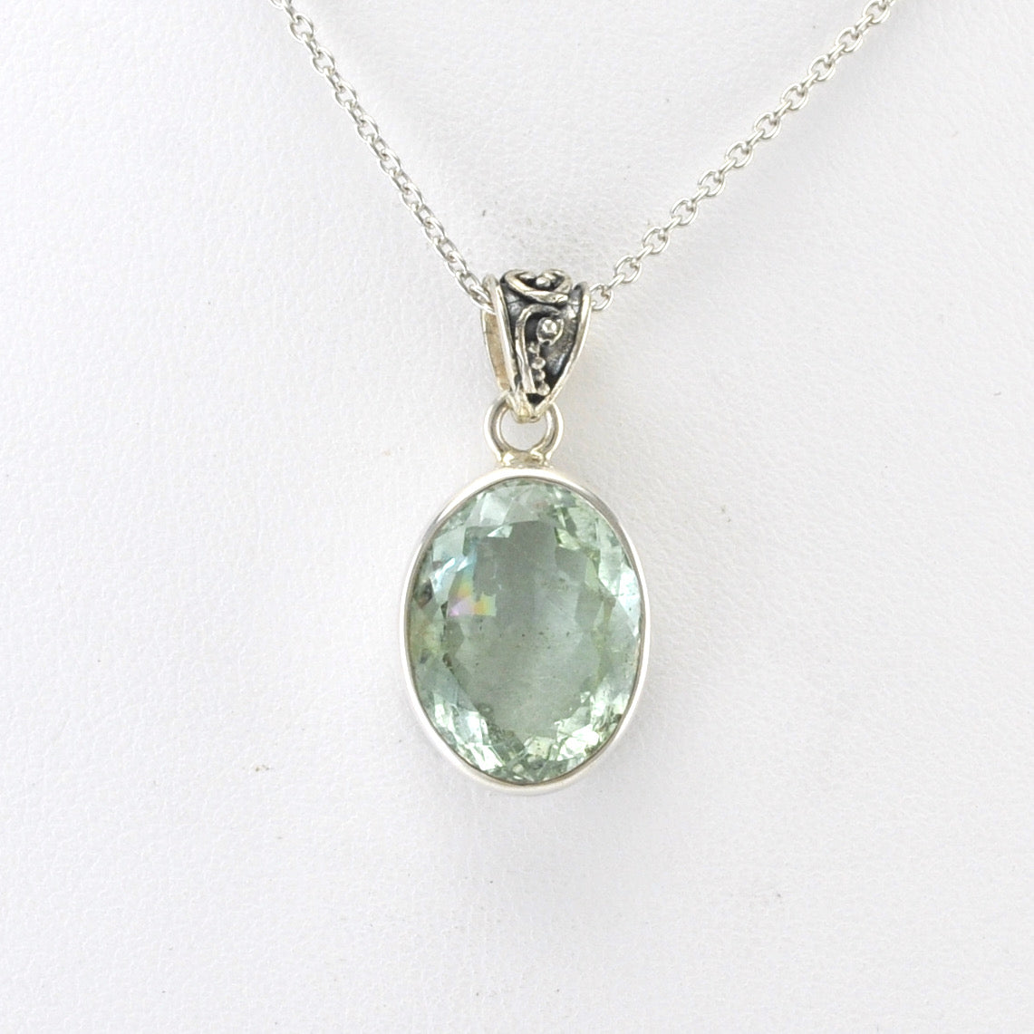 This genuine facet cut oval aquamarine is set in a sterling silver bezel setting with intricate silver work on the bail. Pendant is 7/8 inch long and 7/16 inch wide and comes on an 18 inch long silver cable chain. To clean: simply use a jewelry polishing cloth to brighten the silver when needed.