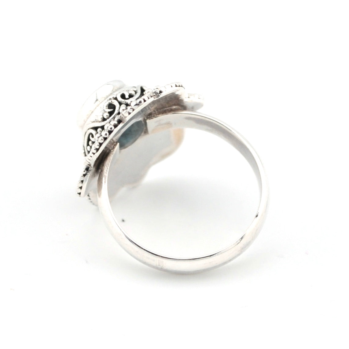 This intricate blue topaz oval ring is handcrafted in Bali with sterling silver. Delicate scroll and beadwork showcase the artistry of Balinese design, highlighting the brilliance of the gemstone. Ring is 7/8 inch wide and is a size 7.