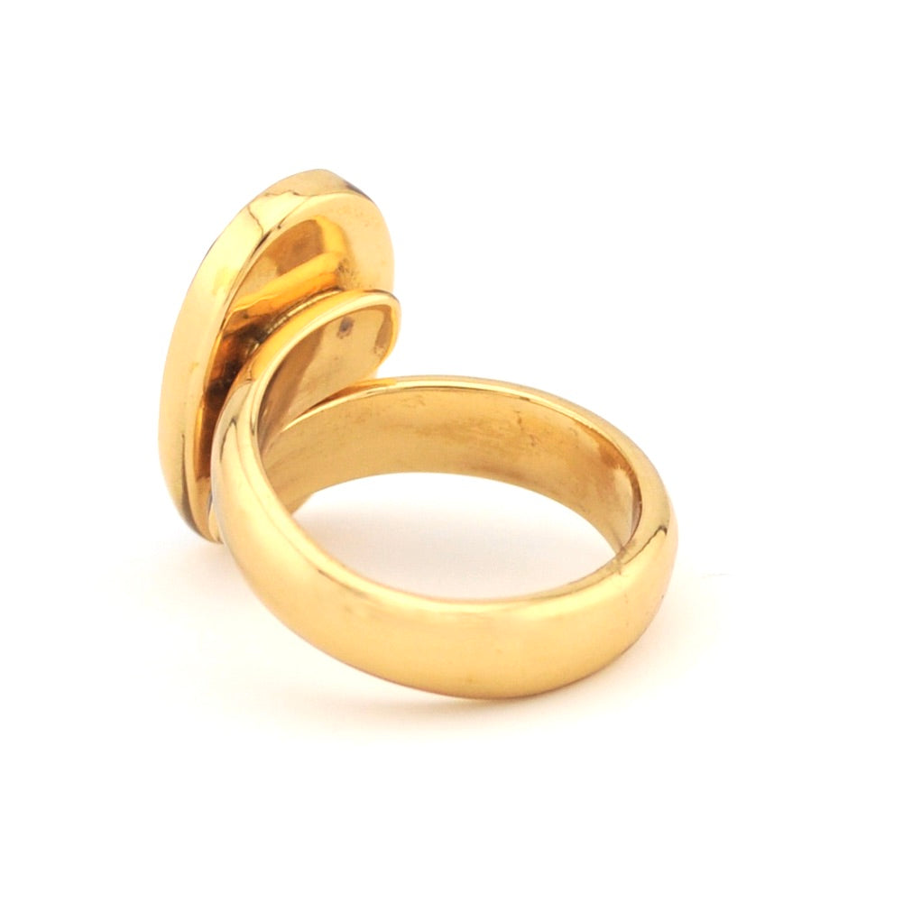 This genuine lapis lazuli faceted oval gemstone is set in a gold tone metal called alchemía by Charles Albert. Alchemía, a blend of base metals that look like 18k gold that will not change color and is hypoallergenic. Ring is adjustable.