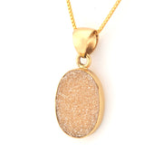 Sparkly champagne colored druzy agate oval gem is set in a pendant setting that is made of a blend of metals called alchemía. Alchemía is a blend of base metals that have the look of 18k gold that is lead free, nickel free and hypoallergenic. Pendant has a baked lacquer finish to protect the metal from tarnishing. Pendant is 1 5/8 inches long and 3/4 inch wide and sold separate from the chain shown.