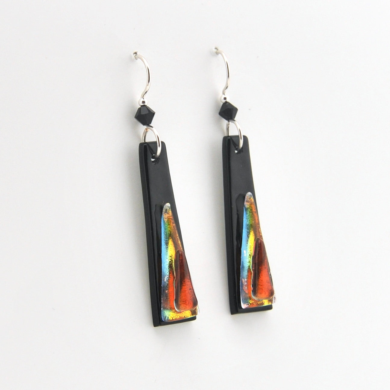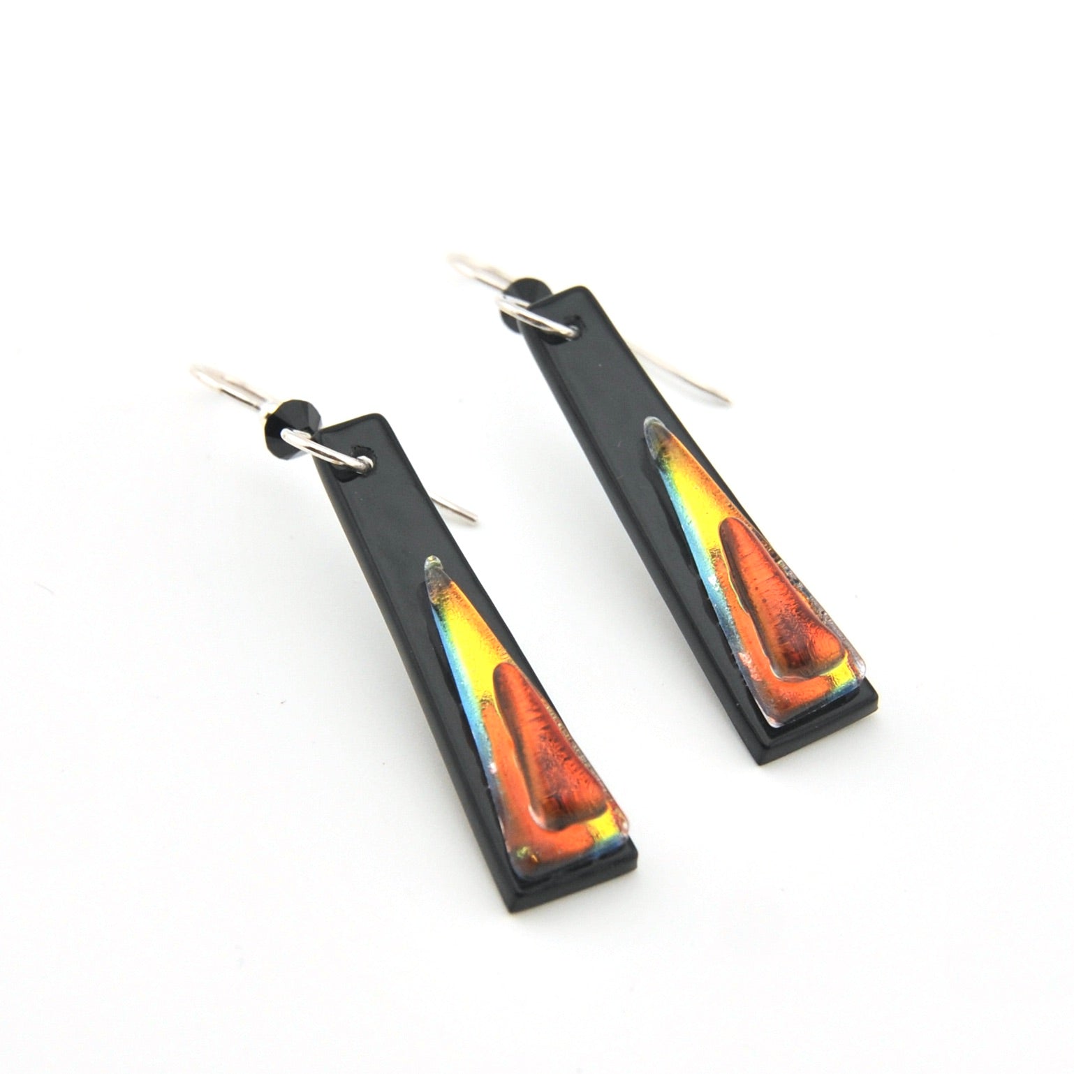 These handmade fused glass earrings feature a black elongated trapezoid with iridescent gold and coral glass hanging from a ear wire. Dangle earrings are 2 1/8 inches long and 1/2 inch wide. Earrings come inside a jewelry gift box. The wires are sterling silver filled and come with a pair of clear rubber earring stoppers.