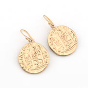 These fun treasure coin earrings are handmade with a blend of metals called alchemía. Alchemía is a blend of base metals that have the look of 18k gold that is lead free, nickel free and hypoallergenic. Earrings have a baked lacquer finish to protect the metal from tarnishing. Earrings come with a pair of clear rubber earring stoppers.