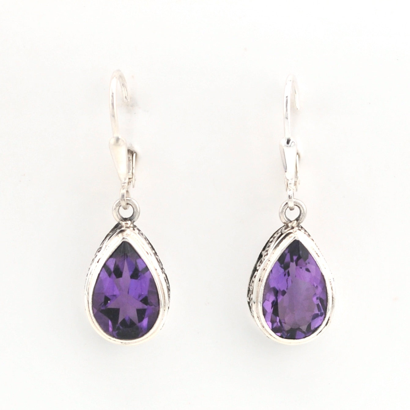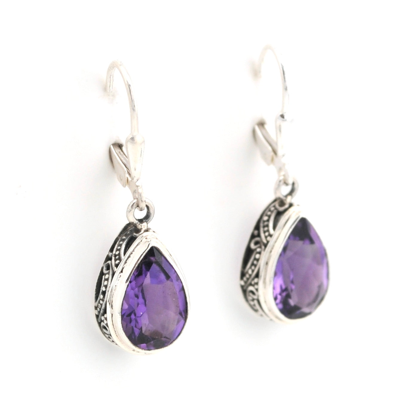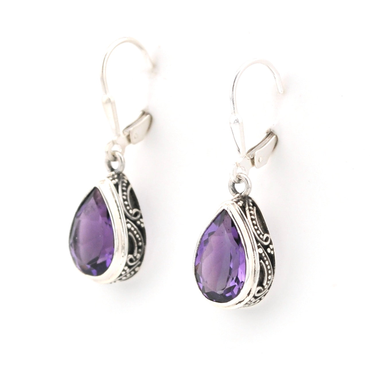 These genuine amethyst teardrop gemstones are set in a sterling silver bezel setting and hang from a lever back wire. Beautiful granulated scroll and bead work surrounds the setting. Dangle earrings were handmade in Bali, Indonesia and are 1 1/2 inches long and 3/8 inch wide. Our earrings come in a jewelry gift box.