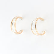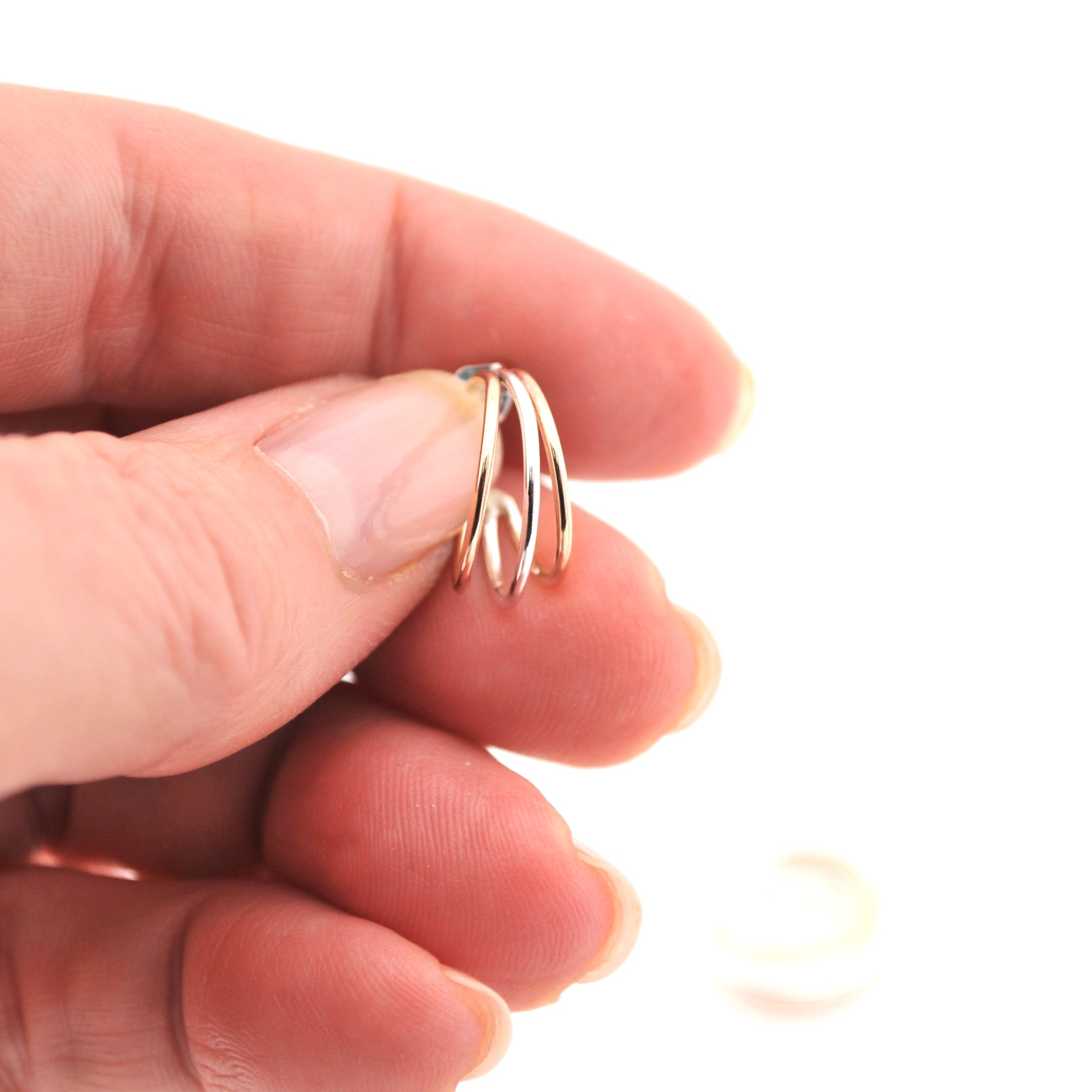 These two tone triple hoop earrings are handmade with sterling silver and gold fill metals. Hoops are 5mm wide and have a 15mm diameter. Gold filled metal is made by bonding gold with another metal. It wears just like 14k gold jewelry, but is a fraction of the price.