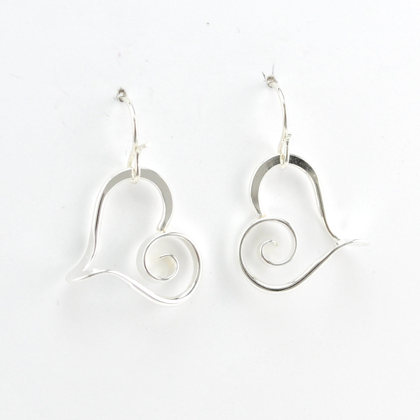These handmade sterling silver heart earrings from Utah. Hearts are very sculptural and have a scroll on one side. Dangle earrings are 1 18 inches long and 5/8 inch wide and come with a pair of clear rubber earrings stoppers for the ear wires.