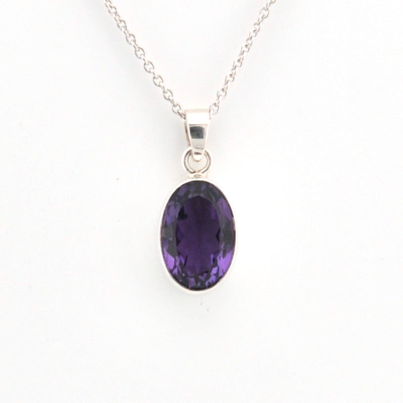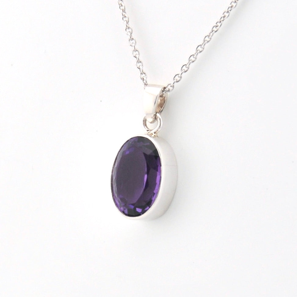 This beautiful necklace features a genuine 9x13mm deep purple amethyst set in a smooth sterling silver bezel. The pendant measures 7/8 inch long by 3/8 inch wide and hangs from an 18-inch sterling silver cable chain — a timeless design that brings rich color and understated elegance to any outfit.