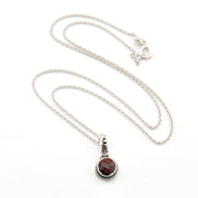 This genuine faceted round garnet gemstone with a checker board cut is set in a sterling silver bezel setting with rope work around the bezel and scroll work on the bail. Pendant is 3/4 inch long and 3/8 inch wide and comes on an 18 inch long silver cable chain. To clean: simply use a jewelry polishing cloth to brighten the silver when needed.