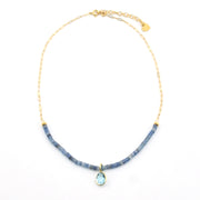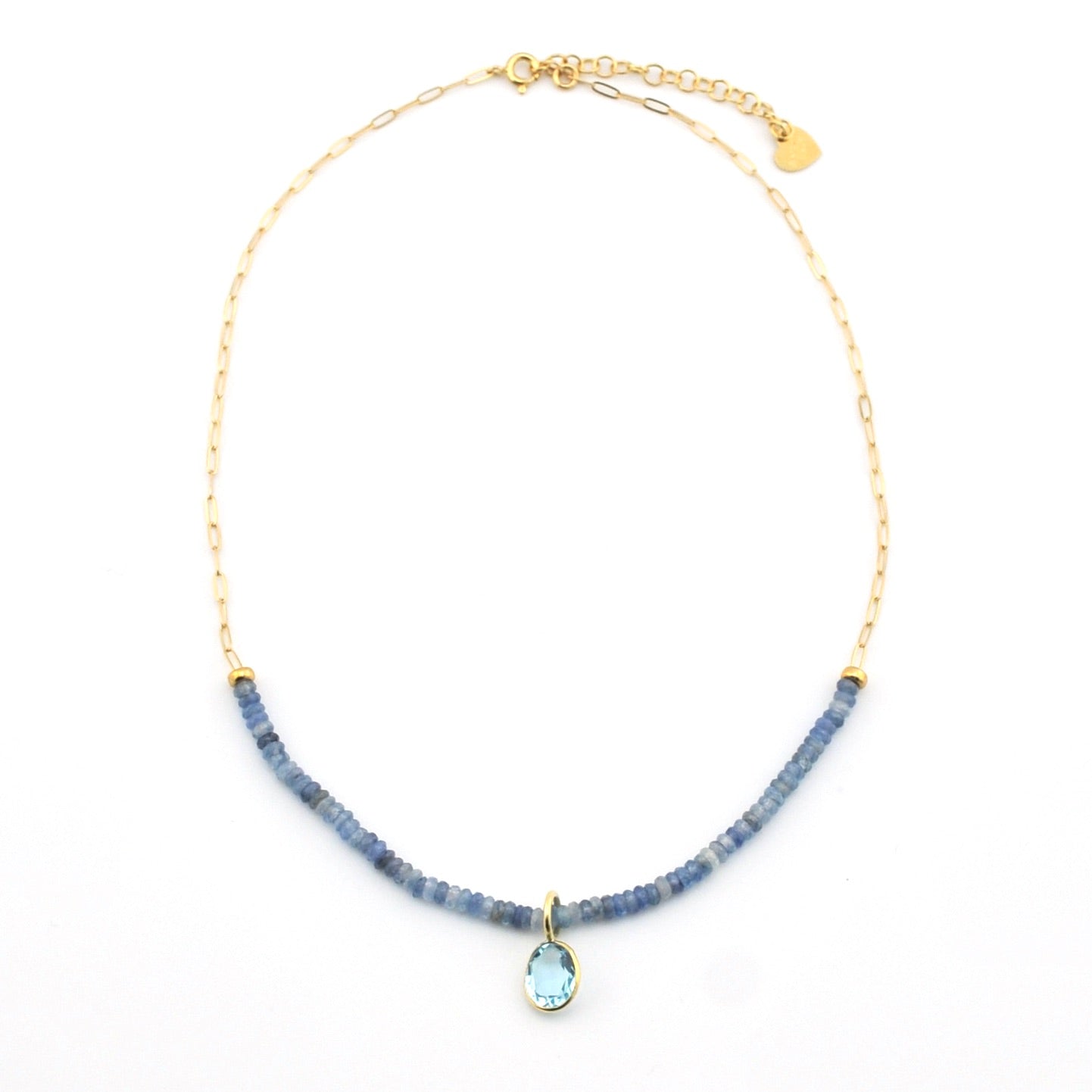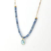 Genuine blue topaz 8x10mm oval gemstone is set in a simple bezel setting and hangs on a kyanite bead with paperclip chain necklace. Necklace is adjustable between 16 and 18 inches with a heart tag extender.