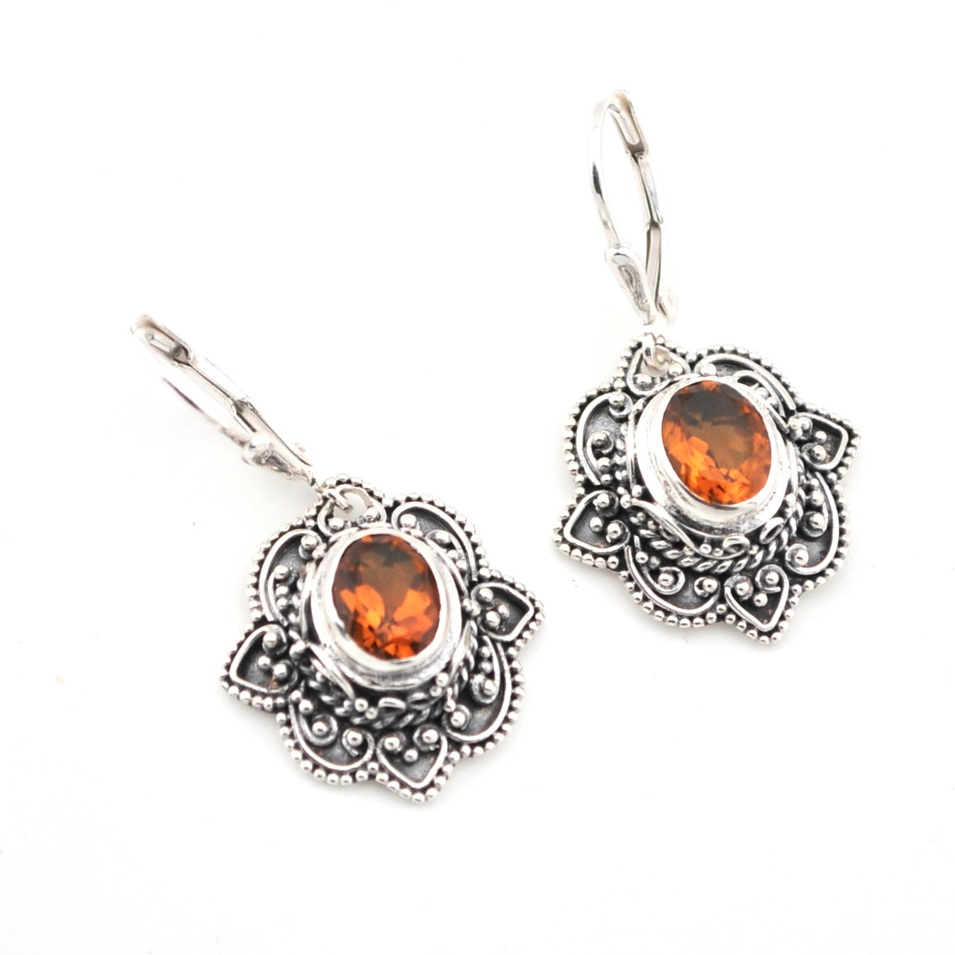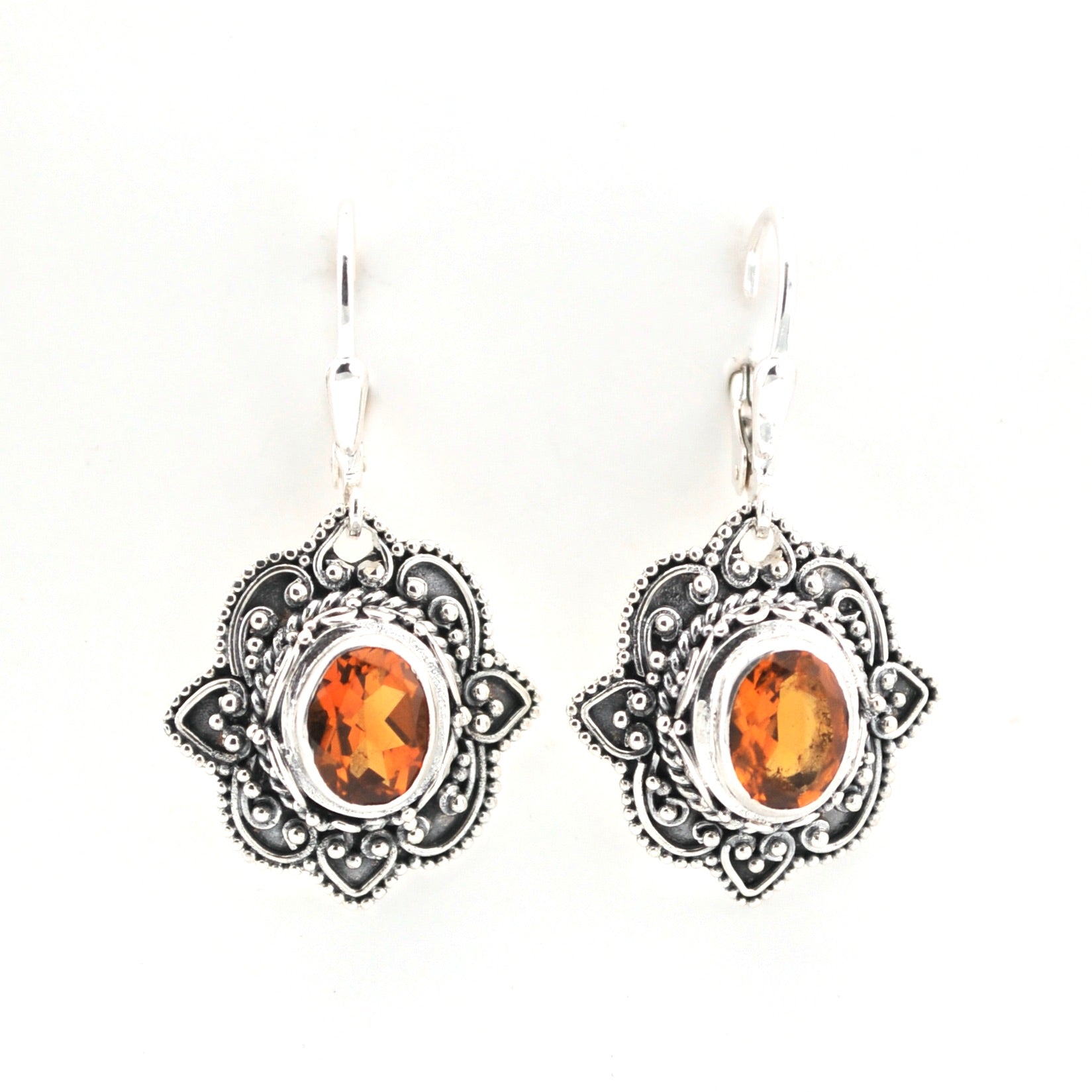 These intricate citrine earrings are handcrafted in Bali from sterling silver. Delicate scroll and beadwork showcase the artistry of Balinese design, highlighting the brilliance of the gemstones. Each earring measures 1⅜ inches long and ¾ inch wide, with a hinged lever-back closure that locks securely behind the ear for comfortable wear.
