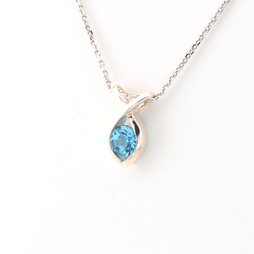 This graceful marquise-shaped pendant showcases a genuine round blue topaz gemstone, radiating brilliant blue color. Handcrafted in sterling silver, the pendant measures 5/8 inch long and 3/8 inch wide and comes on an 18 inch sterling silver cable chain — a simple yet timeless design perfect for everyday elegance.