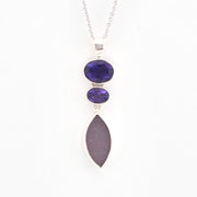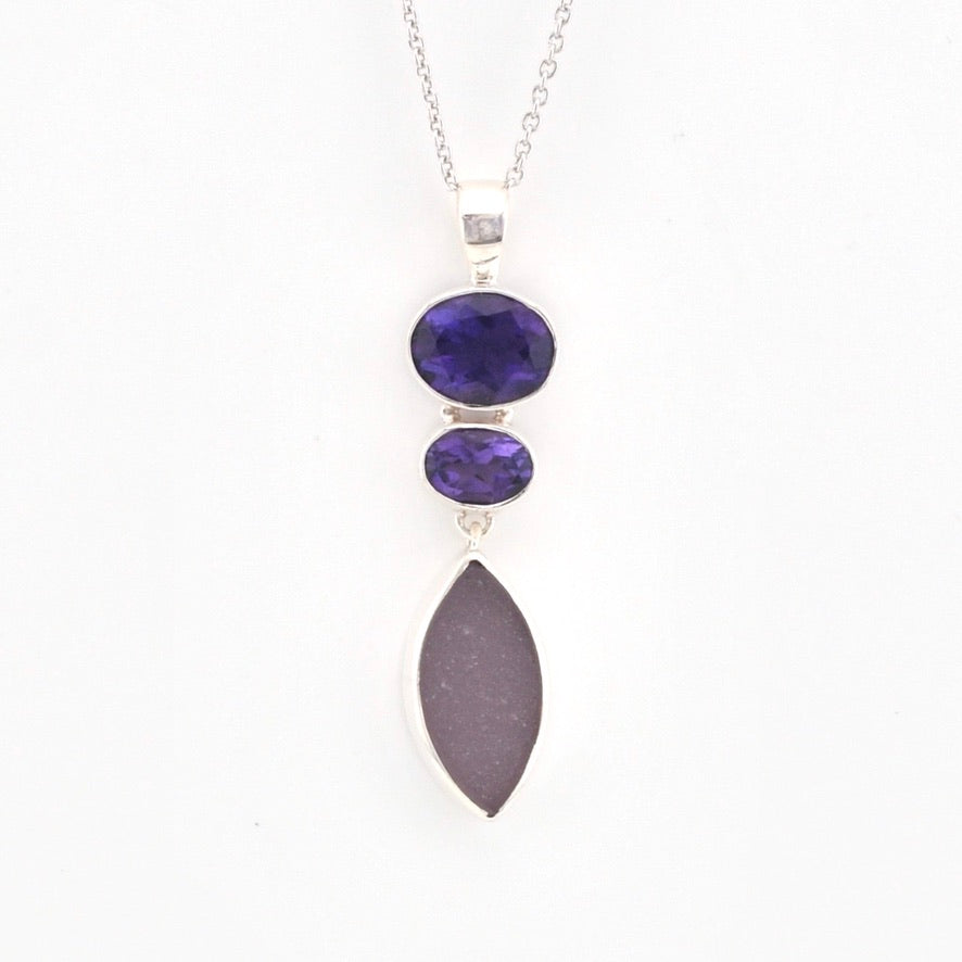 Handmade sterling silver necklace has two deep colored amethyst gemstones with lavender sea glass from Maine. Pendant is 1 5/8 inches long and 3/8 inch wide and comes with an 18 inch long silver cable chain.