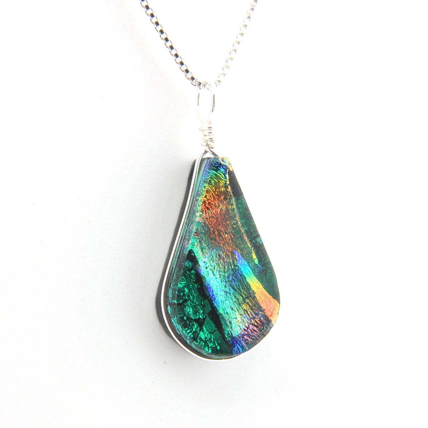 This handmade dichroic glass teardrop pendant is a green with a rainbow of colors that shimmer in the light. This pendant is sold separate from the silver box chain shown and is 1 3/8 inches long and 5/8 inch wide. Pendant comes inside a jewelry gift box.