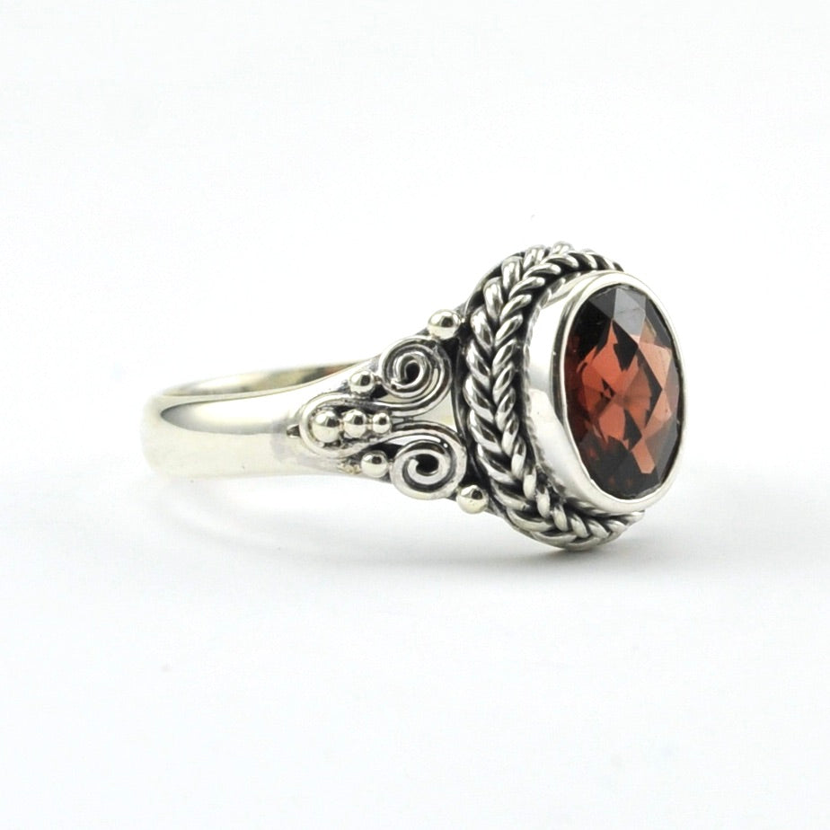This garnet oval gemstone is set in a sterling silver bezel ring setting that has beautiful scroll and bead work on the sized of the band. Garnet gemstone has a checkerboard cut. Ring is a size 7 and can be sized.