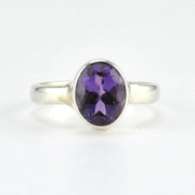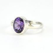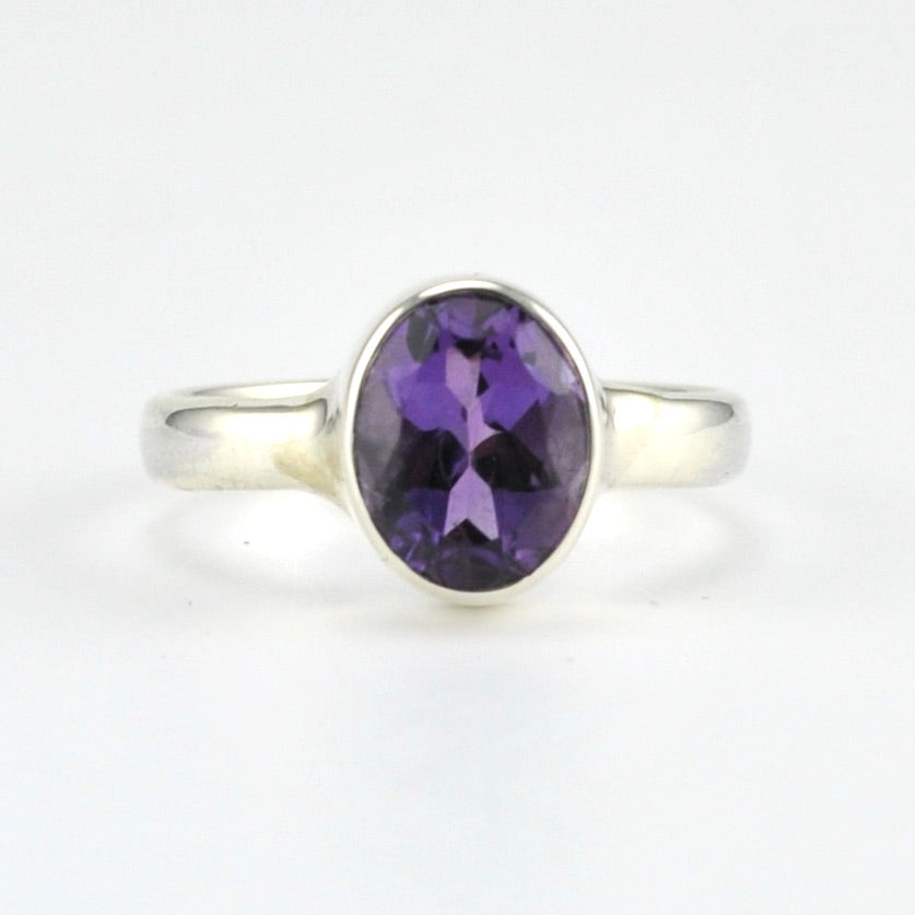 Genuine amethyst faceted 7x9mm oval gemstone is set in a sterling silver bezel ring setting. Ring is a size 6 and can be sized.