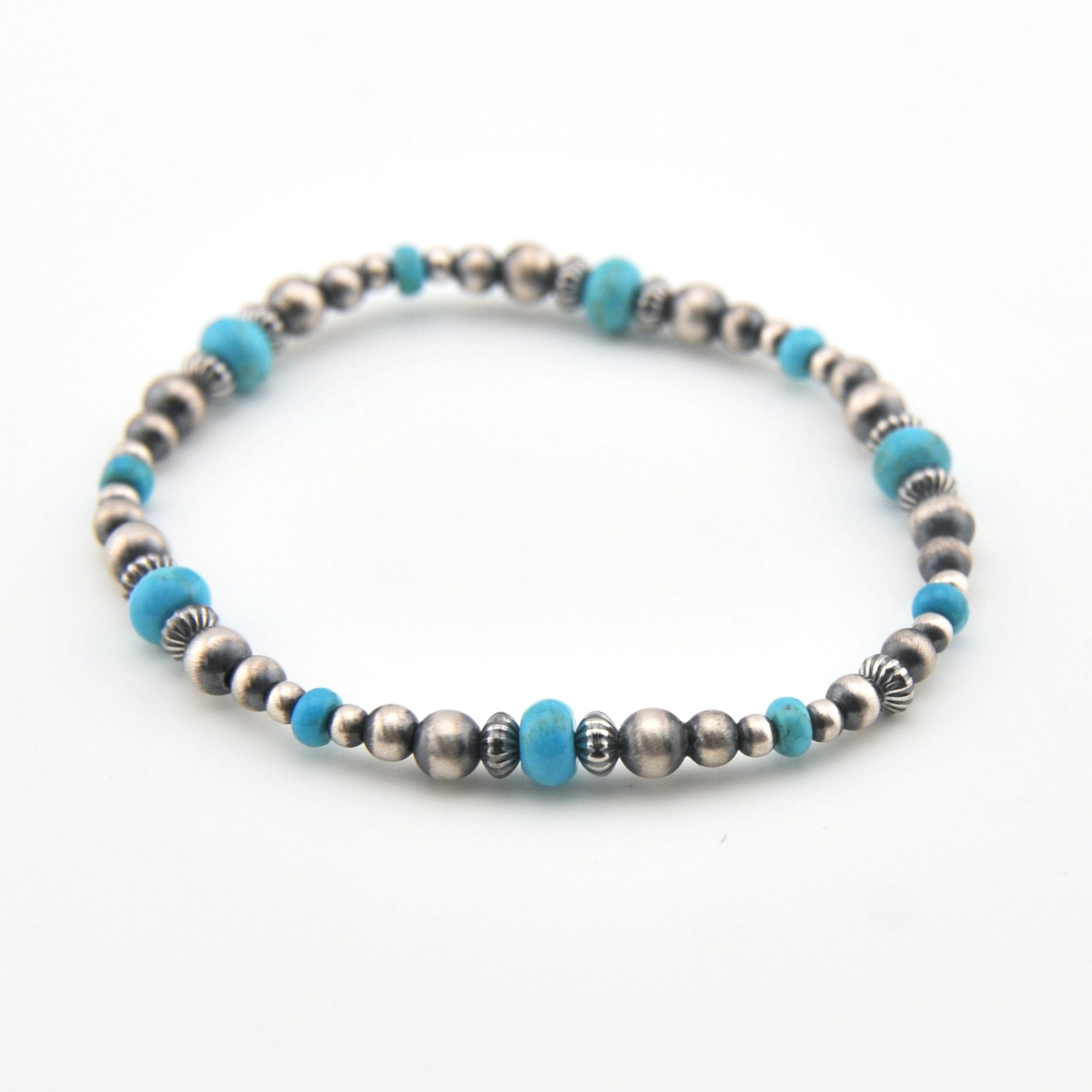 This handmade stretch bracelet features brushed sterling silver beads paired with genuine Campitos turquoise, celebrated for its vibrant blue color. Authentically Southwestern and made in the USA, this bracelet offers a comfortable one-size-fits-most fit.