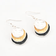 These three layered circle drop earrings features wavy coin pieces stacked with a mix of gold and silver tones that dangle from a silver wire. Earrings come with a pair of clear rubber earring stoppers.